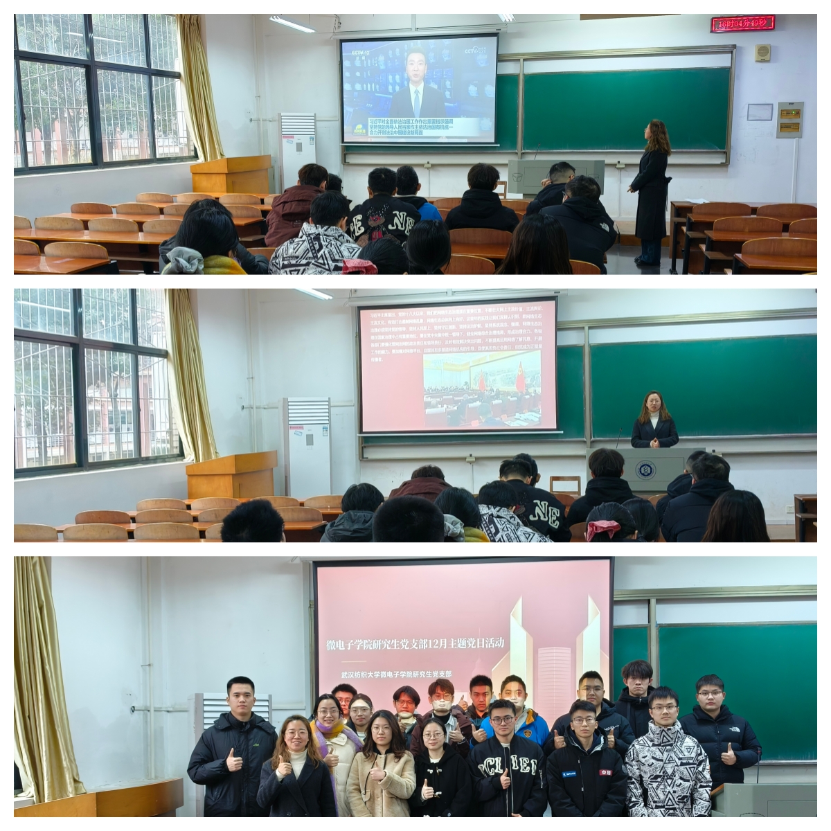 12月30日,武汉纺织大学微电子学院研究生党支部在崇志楼112教室开展12月主题党日活动,专题学习习近平总书记对全面依法治国工作的重要指示,以及中共中央政治局第二十三次集体学习关于网络生态治理的重要讲话精神,支部全体研究生党员参会。本次会议由支部书记卫周瑶主持。