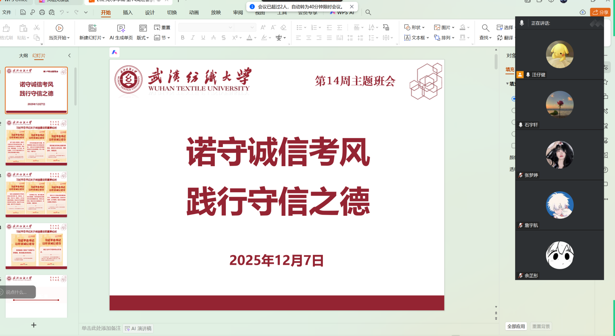 2025级作为新生年级,班会以“夯实诚信根基,迈好大学应考第一步”为核心。辅导员带领新生系统学习习近平总书记关于诚信建设的重要论述,逐条解读《武汉纺织大学学生考试违纪处理办法》中基础违纪情形,通过“萌新应考答疑会”解答新生关于考试流程、证件携带等疑问,还组织学习艾宾浩斯记忆法、番茄学习法等备考技巧,帮助新生摒弃侥幸心理,以科学方法和诚信态度迎接首次大学期末考,全体新生郑重签署《考试诚信承诺书》。
