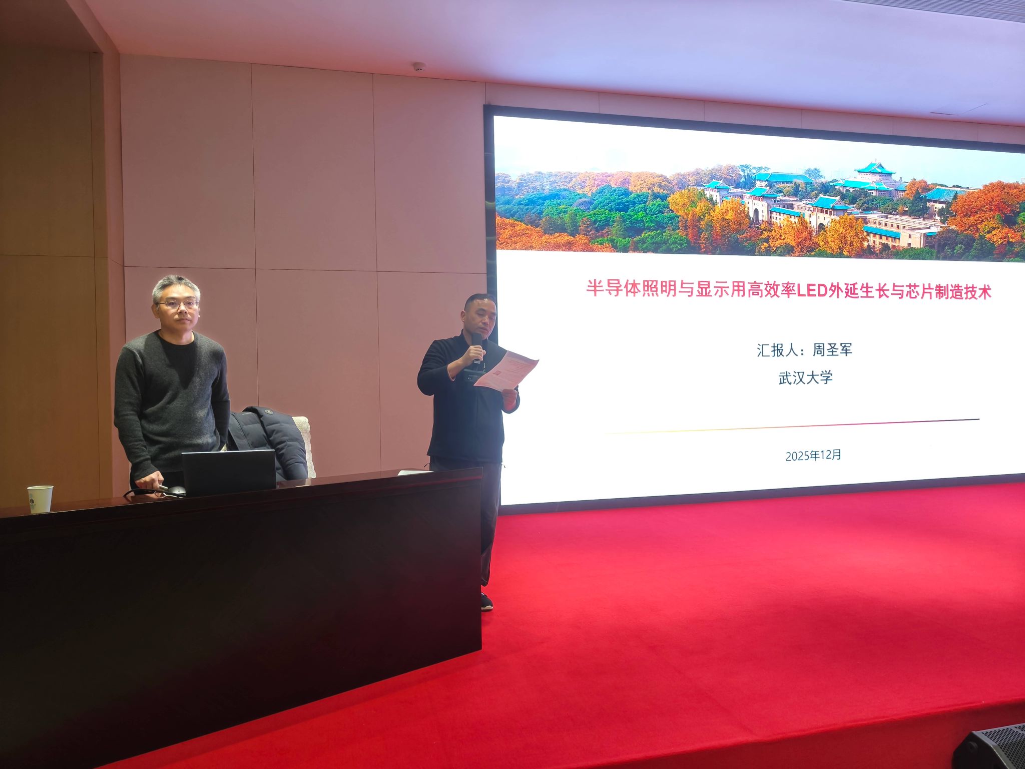 开场中,陈长清院长对周圣军教授在氮化物半导体、LED外延生长与芯片制造等领域的长期研究及重要成果进行了介绍,并对周教授莅临我校交流表示热烈欢迎。他表示,氮化物LED技术是支撑新型显示、照明以及深紫外应用的重要基础,本次报告对学院的科研与人才培养均具有重要启发意义。