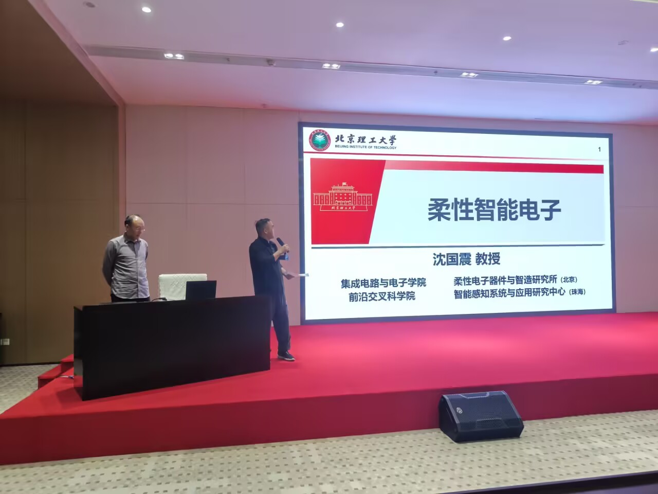 在报告中,沈国震教授从柔性电子技术的背景与发展讲起,指出传统硅基器件在机械柔顺性和应用场景方面存在天然限制,而柔性电子凭借可弯折、可拉伸、轻量化等特性,为可穿戴设备、健康监测、人机交互以及国防装备带来了新的可能性。他系统介绍了团队近年来在低维半导体构筑、柔性传感器设计、柔性晶体管开发以及智能可穿戴系统集成方面的重要进展,展示了多个具有代表性的科研成果和应用案例。