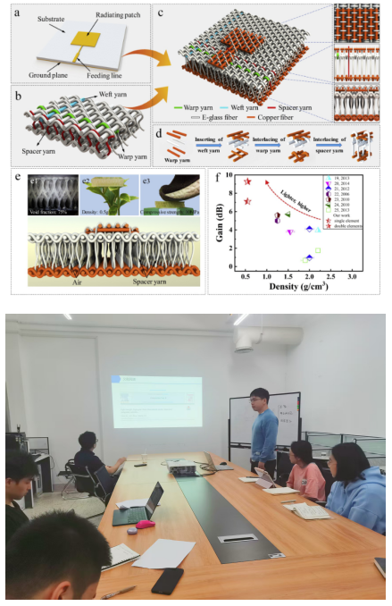 尤日健:本次组会汇报了一篇文献《超轻质高增益三维纺织结构复合天线》。该研究探究了三维机织间隔微带天线(3DWS-MA)的设计、制备,旨在突破航空航天领域传统承载天线难兼顾结构完整性与功能性能的痛点(传统天线或易分层、或增益低、或密度高)。尽管近期相关研究多聚焦复合天线单一性能优化,但其对 “三维织造实现天线与复合材料一体化,及间隔纱调控多性能协同” 的探索尚不充分。研究发现,通过3D织造将铜纱(辐射贴片、接地平面)与E-玻璃纤维间隔纱整合,形成“8”字形中空基板(空气体积分数75%):基板密度仅0.5g/cm³、介电损耗0.0085;单单元天线2.46GHz频段峰值增益7.11dB,双单元达9.27dB,远超传统微带天线(2.5dB);18J冲击下仍保持S11<-10dB的良好电磁性能,而传统三明治复合天线2J冲击即因分层失效,且铜纱传输线性能接近铜箔。结果表明,3DWS-MA的“结构-功能”一体化设计,填补了传统天线在航空航天应用的性能空白,对飞机、卫星等共形承载天线意义重大,为多功能复合天线发展提供新范式。