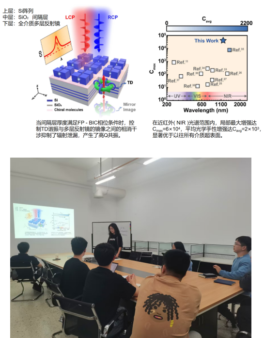付丹丹:本次组会汇报了一篇文献,题为《用于超灵敏手性检测的环形偶极子Fabry–Perot连续体束缚态超表面》。这篇文章的核心是解决传统圆二色光谱技术因手性分子与光波长尺度不匹配而导致的信号微弱、检测灵敏度低的难题。研究团队创新性地提出了一种由环形偶极子共振与多层介质反射镜协同作用的超表面结构。首先通过“双对称破缺”的设计,成功激发了对偏振不敏感的环形偶极子共振,在纳米结构外部产生了约100倍的平均光学手性增强。随后,通过引入Fabry-Perot腔机制,精确调控该共振与其镜像的干涉,形成了连续体中的束缚态,从而将光学手性增强推向极致——在非结构区域实现了高达6万倍的局域增强和2200倍的平均增强。最终,在传感实验中,该平台将手性分子的圆二色信号增强了866倍,性能远超当前主流技术。这项工作不仅为超灵敏手性检测提供了一个强大的平台,其设计思路对调控光与物质相互作用也具有重要的启发意义。