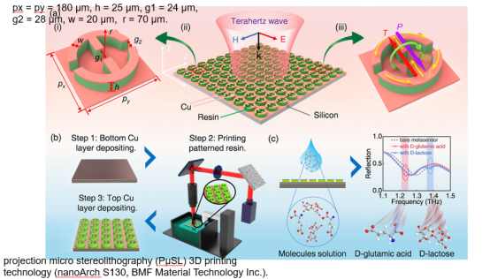 程思洋:本次组会汇报了《Terahertz molecular vibrational sensing using 3D printed anapole meta-biosensor》这项研究。该工作聚焦于解决太赫兹分子传感中的关键技术难题:如何实现高灵敏度、无标记的多组分生物分子检测。针对传统折射率传感特异性不足、以及多共振结构设计复杂的问题,本研究创新性地设计并制备了一种基于无辐射态(anapole mode)的金属-介质-金属结构太赫兹超表面。该结构采用投影微立体光刻(PµSL)3D打印技术进行加工,通过精确调控结构参数,使其工作于过耦合状态。与追求高Q值的传统思路不同,这种低Q值的宽频共振模式能够产生大范围的电磁场增强,从而有效放大多个分子的特征振动指纹信号。实验结果表明,该传感器在对D-葡萄糖的检测中表现出优异性能,其检测限低至0.84 mg/mL,灵敏度达到0.54%/(mg·mL⁻¹),覆盖了糖尿病监测的生理相关浓度范围。更重要的是,研究成功利用该单一谐振超表面,结合主成分分析(PCA)与支持向量机(SVM)算法,对包括糖类和氨基酸在内的五种不同分子实现了100%的准确分类。这验证了其在无需复杂化学修饰的前提下,对混合样品进行同步识别和定量分析的强大能力。