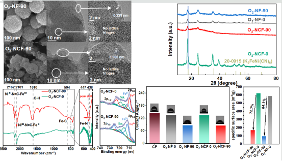 王孝灿:本次组会汇报了近期工作,研究了氧气等离子体处理驱动镍铁铬普鲁士蓝发生了根本性的相变:其氰根桥联骨架被高活性氧物种破坏,导致氰根配体氧化脱除,同时金属离子(Ni, Fe, Cr)被氧化并重组,最终生成由Cr₂O₃、NiO及潜在的Ni(Fe, Cr)₂O₄尖晶石相等组成的金属氧化物混合物。这一转变由拉曼光谱中氰根特征峰(~2182 cm⁻¹)的消失及金属氧化物新峰(如697 cm⁻¹ for Cr₂O₃)的出现所证实。该过程有潜力完美继承普鲁士蓝前驱体的规则立方体形貌,并将其转化为具有多孔结构的高比表面积尖晶石氧化物,为制备高性能电化学材料提供了一种高效的合成策略。