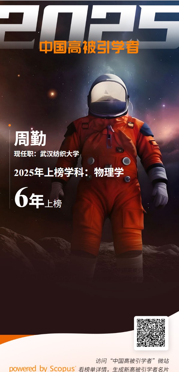 爱思唯尔(Elsevier) 正式发布2025“中国高被引学者” (Highly Cited Chinese Researchers) 榜单。2025“中国高被引学者”上榜共计6310人,来自543所高校、企业及科研机构,覆盖了教育部10个学科领域、83个一级学科。武汉纺织大学微电子学院周勤教授等学者上榜,所属学科为物理学。至此,周勤教授已连续六年蝉联“中国高被引学者”榜单。此外,周勤教授还曾获评科睿唯安全球高被引科学家。