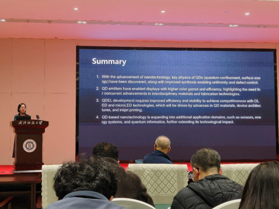 Eunjoo Jang教授以《Perspectives On Quantum Dot Technology: Small Success & Big Impact》为题,带来量子点技术领域的前沿分享。她系统梳理了量子点技术从基础物理发现到高端显示产业核心应用的全发展历程,深入解析了无镉量子点合成、器件集成等关键技术的突破路径,同时剖析了该技术在商业化进程中面临的核心挑战,并结合自身研究成果,展望了量子点技术在生物传感、光伏催化、量子信息等跨领域的应用潜力。