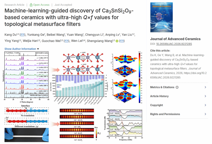 近日,微电子学院汪胜祥教授团队杜康副教授在陶瓷领域国际顶级期刊《Journal of Advanced Ceramics》上发表了题为“Machine-learning-guided discovery of Ca3SnSi2O9-based ceramics with ultra-high Q×f values for topological metasurface filters”的研究成果(https://doi.org/10.26599/JAC.2026.9221285),团队在高性能微波介质材料与高频拓扑器件研究领域取得重要进展。武汉纺织大学杜康副教授为第一作者兼通讯作者、魏国超博士和汪胜祥教授为论文的共同通讯作者。