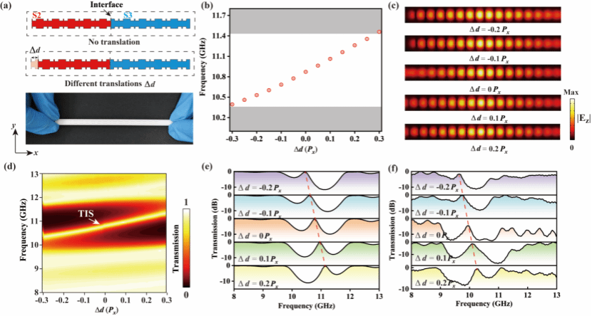 依托上述自研材料作为介质基板,结合双层被银工艺,团队进一步完成X波段可调谐拓扑超表面滤波器的设计、制备与测试。该器件利用对称性破缺诱导拓扑相变,在界面处产生局域拓扑界面态,具备传输效率高、品质因子可调、工作频率可定制化等突出优势,可满足毫米波通信、射频系统、卫星终端等场景对低损耗、高稳定滤波器件的迫切需求,实现了从关键材料到功能器件的直接转化。