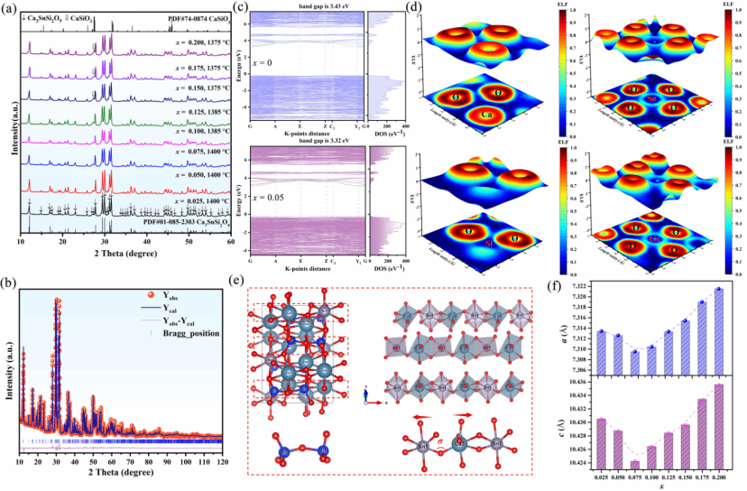 当前,毫米波通信、万物互联及新一代卫星通信技术快速发展,高频滤波器、介质谐振器、超表面天线等核心器件对基础材料提出低介电常数、超低损耗、宽温稳定的严苛要求。传统微波介质陶瓷研发高度依赖 “试错法”,存在实验量大、周期长、成本高、构效关系不明确等短板,且将高性能介电材料与拓扑超表面器件相结合的全链条研究仍处于起步阶段。面向国家新一代信息通信技术发展需求,团队创新性将可解释机器学习引入陶瓷材料理性设计,构建小样本高精度性能预测模型,借助SHAP与部分依赖分析破解模型 “黑箱” 问题,精准锁定影响介电性能的关键结构因素。在此指导下,团队在枪晶石型Ca3SnSi2O9基材料中实现了优异的介电性能:εr = 8.88, Q×f = 120413 GHz, τf = ‒25.8 ppm/oC,创下枪晶石型硅酸盐材料体系性能与热稳定性协同优化的新纪录,并基于该材料实现X波段可调谐拓扑超表面滤波器的研制。