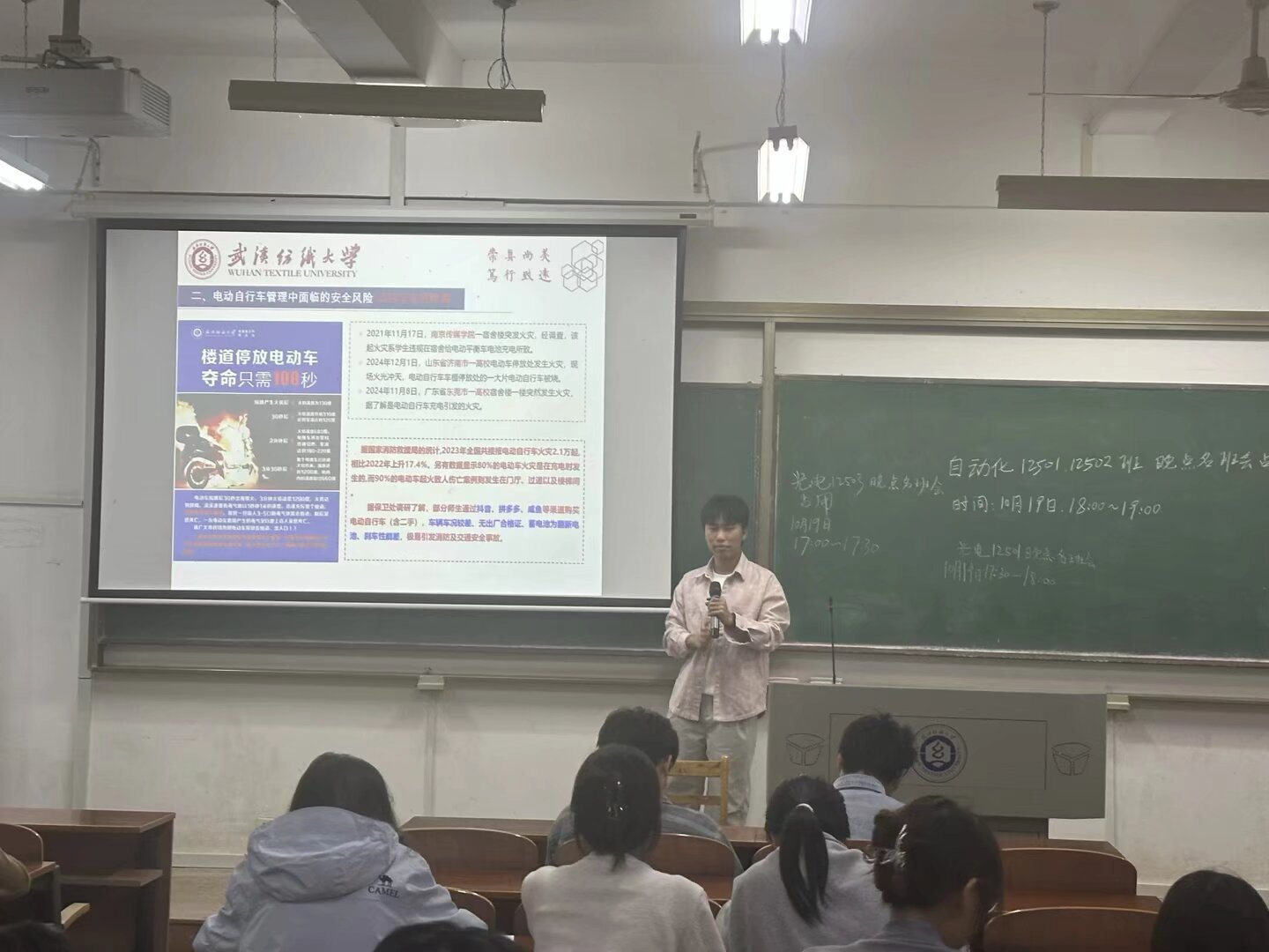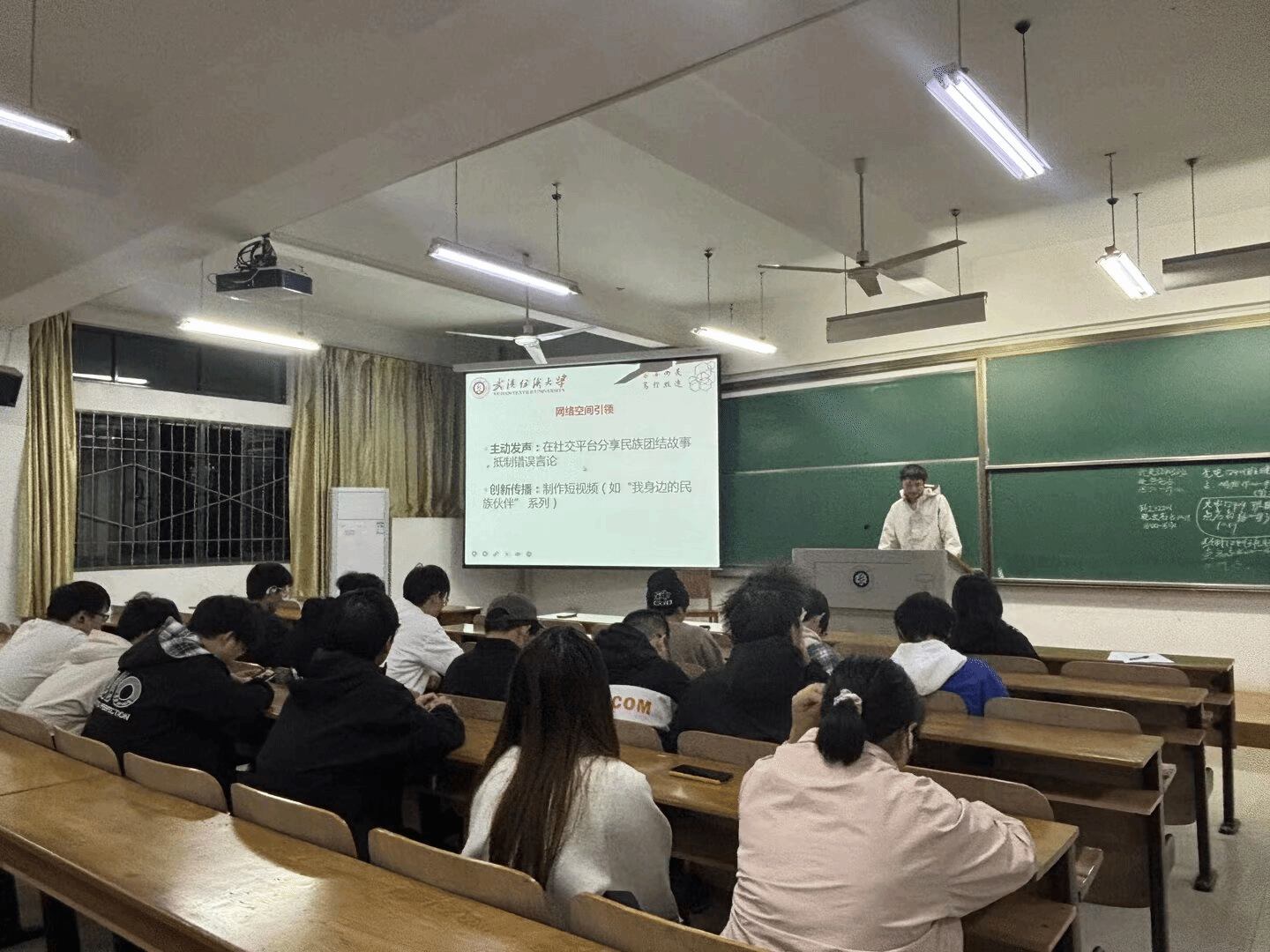 2024级辅导员苗帅在晚班会教育中,聚焦“铸牢中华民族共同体意识”与“校园电动自行车治理”两大主题。在铸牢中华民族共同体意识方面,深入解读其概念,强调各民族休戚与共,通过历史脉络展现其发展,明确其对国家统一、学生发展的重大意义,并指出大学生应在课堂内外、实践服务、网络空间积极践行。对于校园电动自行车治理,分析了校园内电动自行车数量多带来的消防、交通安全风险及校园秩序混乱问题,介绍了学校通过引入共享电动自行车、完善基础设施、开展实名登记授牌等工作举措,并强调下一阶段将持续改进,教育处罚并举规范车辆行停管理,呼吁师生共同维护校园安全与秩序,携手铸牢中华民族共同体意识,共建平安和谐校园。