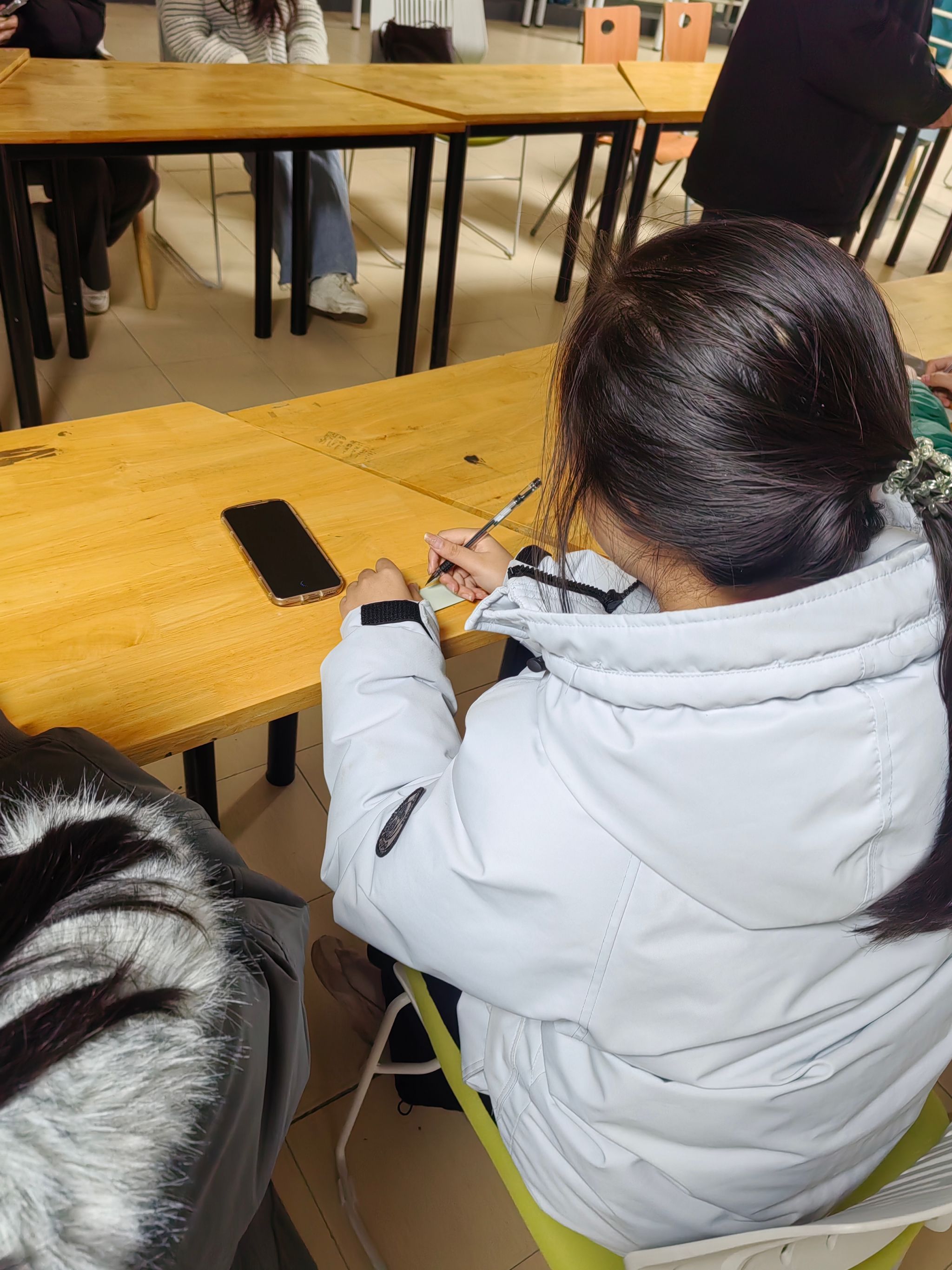 主题活动环节涵盖“心情盲盒”“正念冥想+情绪梳理”“互助支持小约定”三大模块,层层递进引导同学们觉察情绪、释放压力。在核心模块“心情盲盒”中,参与者随机分组,以匿名形式在便签上书写近期心情与困惑,经装饰后投入“心情盲盒”,再由小组代表抽取分享。分享过程中,同学们放下顾虑,认真倾听他人心声,针对复习压力、工作学习平衡等问题交流经验、给出建议,在匿名保护下充分袒露内心,收获了归属感与切实的解决思路。