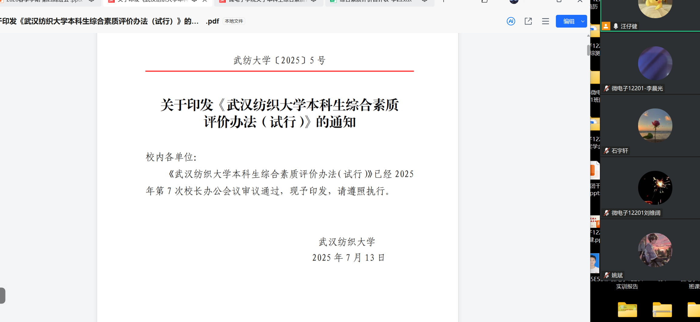 2022级班会突出考研冲刺与就业指导。 各班重温校友王鹏的护旗经历和退役大学生士兵郝建设的奋斗故事,引导学生传承家国情怀,在毕业季坚守初心、勇担使命。心理健康教育关注毕业生的就业焦虑与备考压力,通过情绪调适方法和团队互助机制,帮助学生保持积极心态。辅导员结合综合素质评价的毕业审核要求,详细解读毕业资格与学位授予条件,提醒学生完成学分自查与材料梳理,同时针对求职面试、考研复试等关键节点进行精准指导,鼓励毕业生以实干担当奔赴职场与深造新途,展现纺大学子的良好风貌。